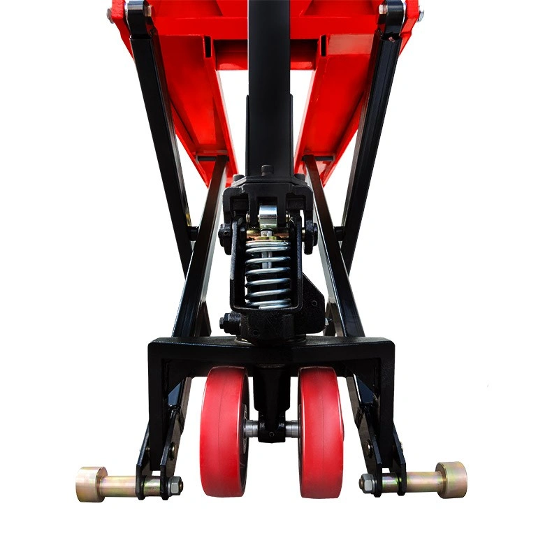 Благодаря телескопической конструкции гидроцилиндра снижены габариты и масса тележки, что значительно повышает удобство ее эксплуатации. Ручка со специальным покрытием делает управление тележкой комфортным в любое время года. При подъеме вил на высоту 400 мм на землю опускаются дополнительные опоры, препятствующие перемещению тележки и повышающие ее устойчивость.