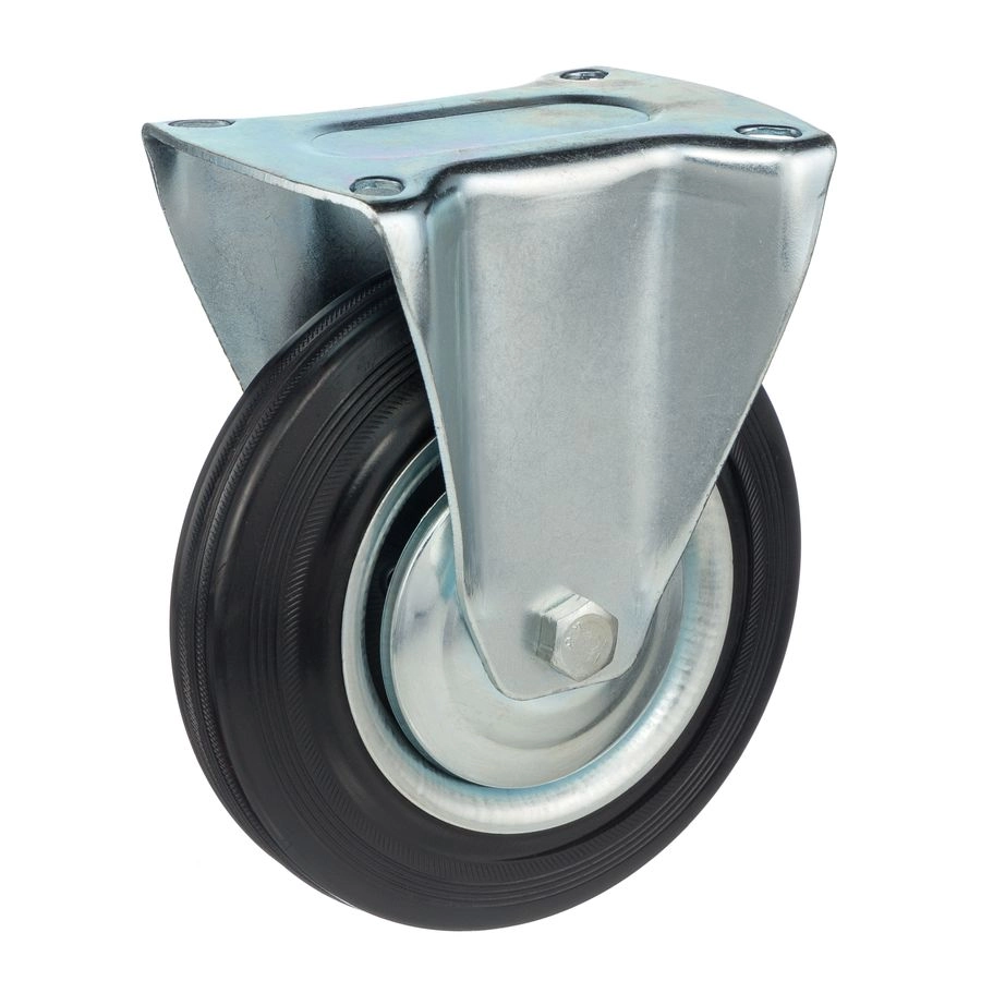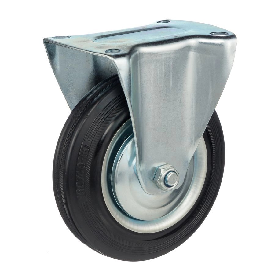 Колесо неповоротное 4002-160, диаметр 160мм., грузоподъемность 145кг. Колеса из черной литой резины, центр из двух гальванизированных дисков из штампованной стали. Роликовый (игольчатый) подшипник расположен в углублении, выдавленном под прессом, и содержит цилиндрические ролики подшипника. Неповоротный кронштейн изготовлен прессованием из листовой стали. Возможно применение на относительно грубых полах складов, заводов, производственных и строительных площадках. Данные колеса можно использовать на неровных поверхностях, во влажной окружающей среде и использовании вне помещения, не рекомендуется применять в среде с органическими растворителями, хлорированными веществами, гидрокарбонатами и минеральными маслами. Температура эксплуатации от -20 до +70С.
