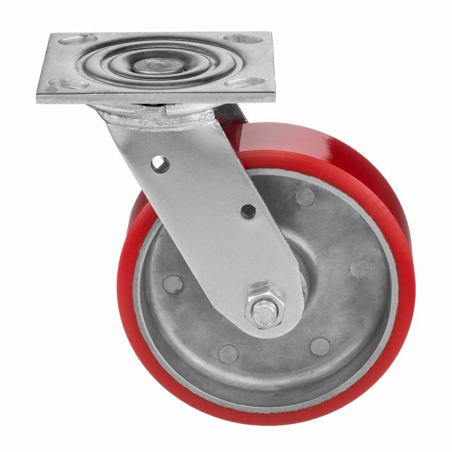 Колесо 1043-152, диаметр 152мм., чугун или полиуретан, поворотное, игольчатый подшипник. Грузоподъемность 360кг. Колесо полиуретановое, центр из литого чугуна. В оси колеса-игольчатый подшипник. Поворотный кронштейн имеет двурядный подшипник. Наличие масленки позволяет периодически обслуживать колесо. Крепление площадка под 4 болта. Колеса полиуретановые с чугунным сердечником широко применяются на бетонных полах преимущественно внутри помещений. Широко используются на тележках, строительных лесах и другом оборудовании, где требуется высокая грузоподъемность. при длительном нахождении под большой нагрузкой не деформируются. Возможно использование вне помещении на твердых покрытиях. Температура эксплуатации от -20 до +50С.