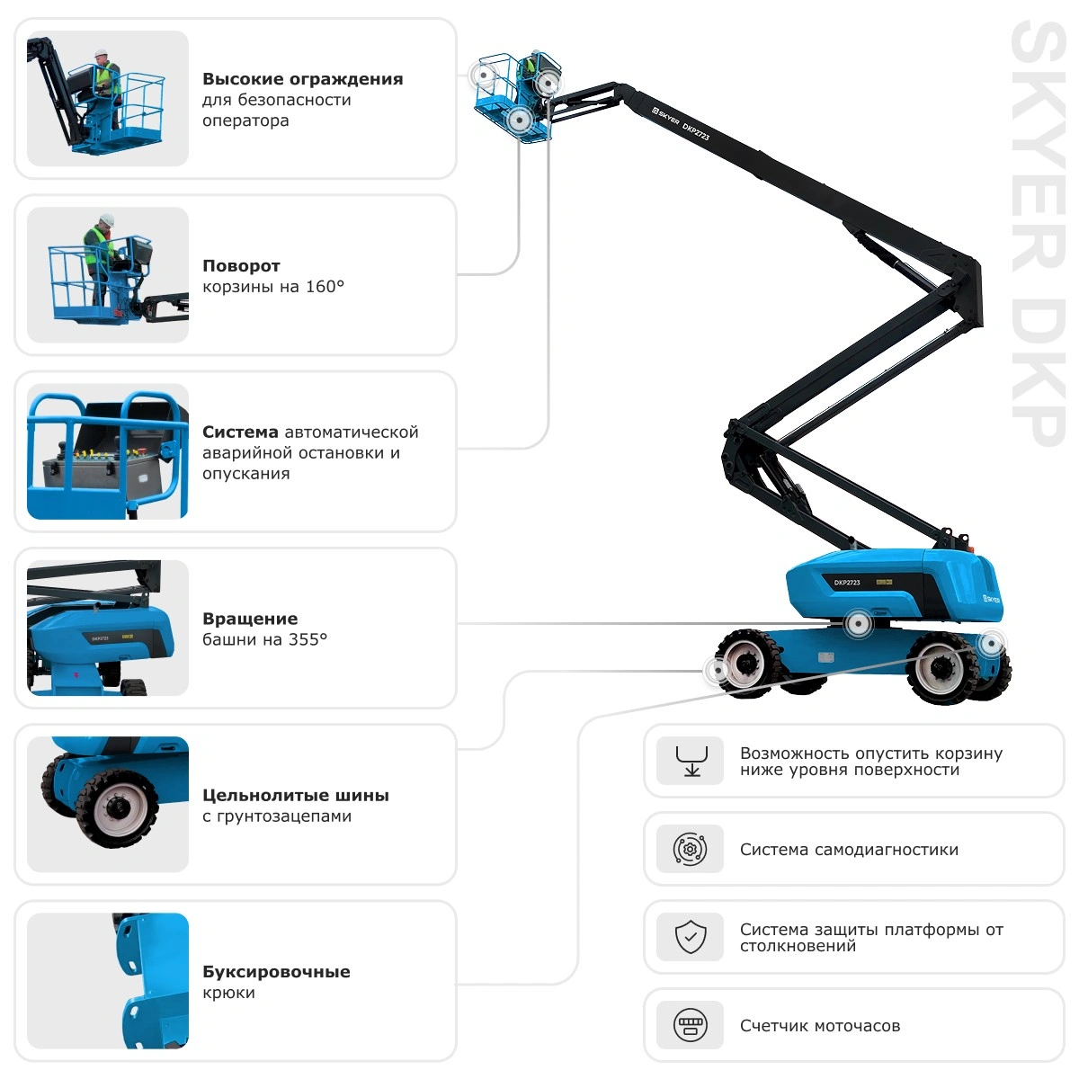 SKYER DKP2723 — идеальное решение для высотных работ на открытых площадках, где от оборудования требуются максимальная автономность и способность обходить препятствия на большой высоте.