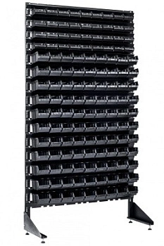 Торговый стеллаж под комплектующие, детали, инструменты с пластиковыми коробочками.