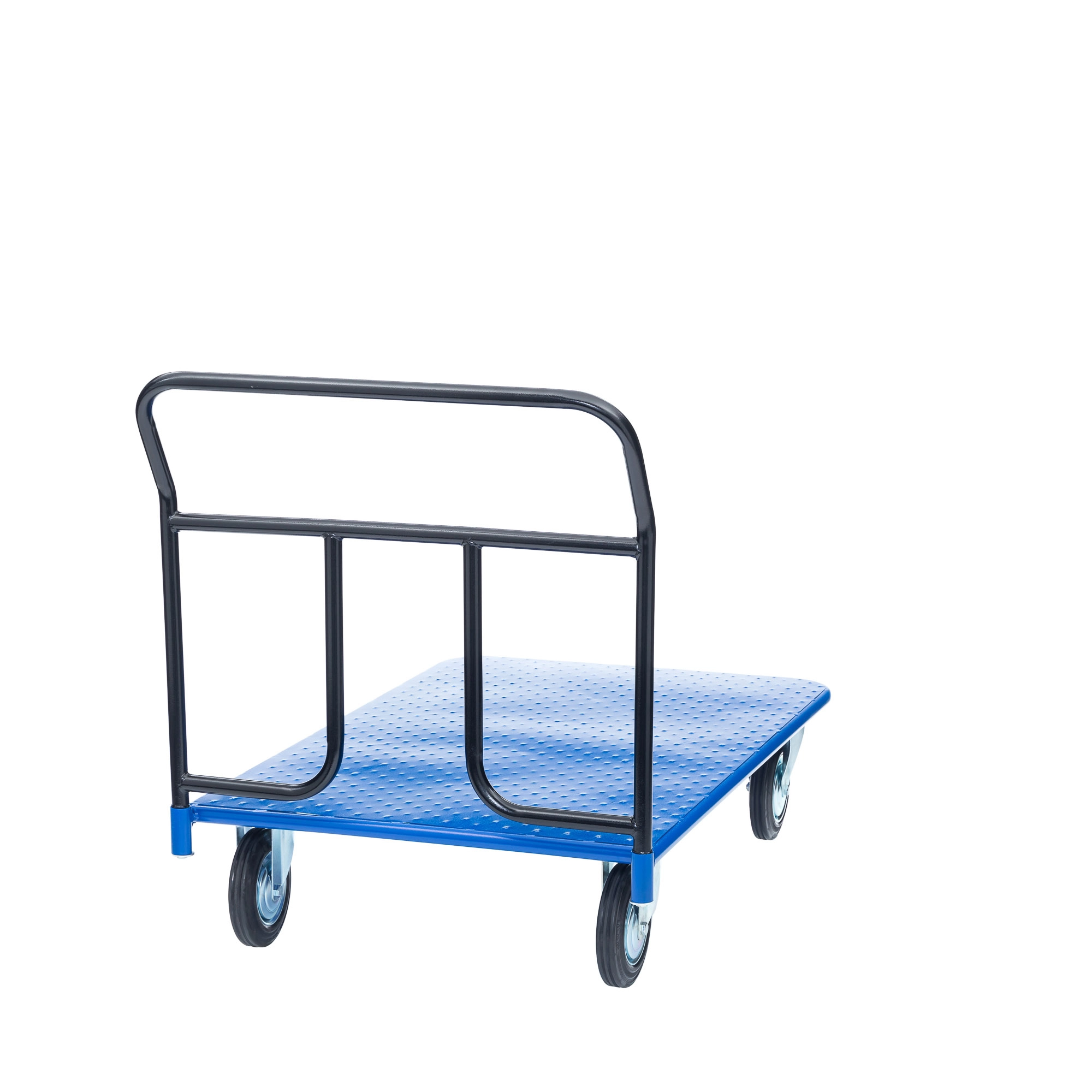 Платформенная 4-х колесная тележка КП-400-150-И используется для перемещения различных грузов в складских помещениях. Ручка крепится к платформе болтами, для компактного хранения можно снять, высота ручки 750мм. Платформа имеет уникальную рельефную, полимерную, противоскользящую поверхность, размером 700х1000мм. Цвет - синий, шагрень. Тележка комплектуется: метизами для крепления, двумя поворотными и двумя неповоротными промышленными колесами, диаметром 150мм., из черной стандартной резины, от всемирно известного, ведущего итальянского производителя Tellure Rota. Грузоподъемность до 450кг.