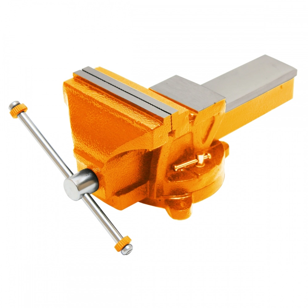 Массивный чугунный корпус и основание покрыты краской, защищающей тиски от коррозии, что увеличивает их рабочий ресурс. Сменные зажимные губки выполнены из закалённой стали высокого качества. Корпус, с возможностью поворота на 360° относительно основания, способствует удобной обработке заготовки. Наличие наковальни расширяет функциональные возможности слесарных тисков. Предусмотрено крепление основания к верстаку (рабочему столу) 3-я болтами.