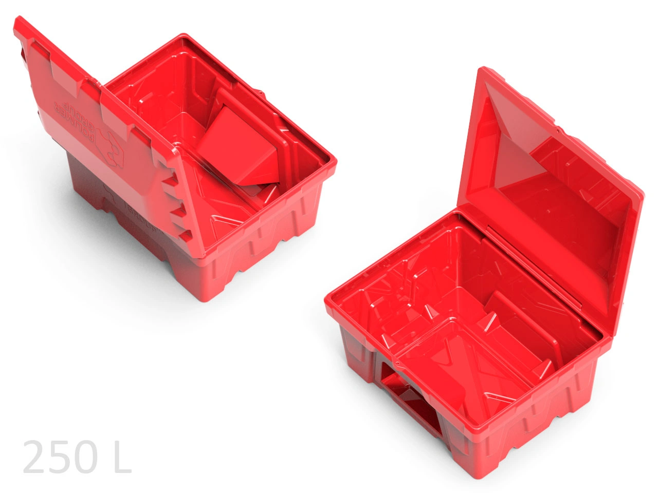 Объем контейнера для песка 250 л. Предназначен для хранения песка, применяемого для тушения пожаров на заправочных станциях. Изготовлен из полиэтилена методом ротоформования, что придает особую прочность.